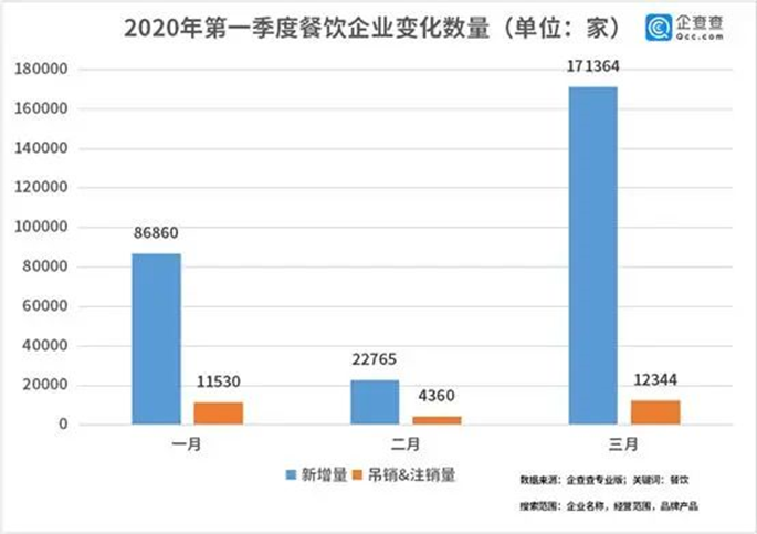 企查查数据显示,今年截至4月15日,我国新增餐饮类相关企业35.9万家,二月新增量不足一月的26.4%,三月的新增量最高,共新增相关企业17.1万家,环比增长率达652.8%,但相应的,三月注销餐企也达到了1.2万家,达到一季度峰值,是同期新增量的7%左右。